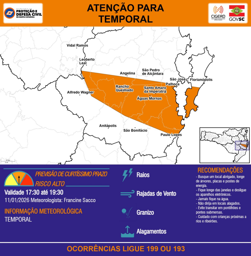 ATENÇÃO – 11/01 17:30 – TEMPORAL com RAIOS, RAJADAS DE VENTO, GRANIZO e ALAGAMENTOS para as regiões da Grande Florianópolis e Alto Vale do Itajaí nas próximas 2 horas. Ocorrências ligue 199 ou 193.
