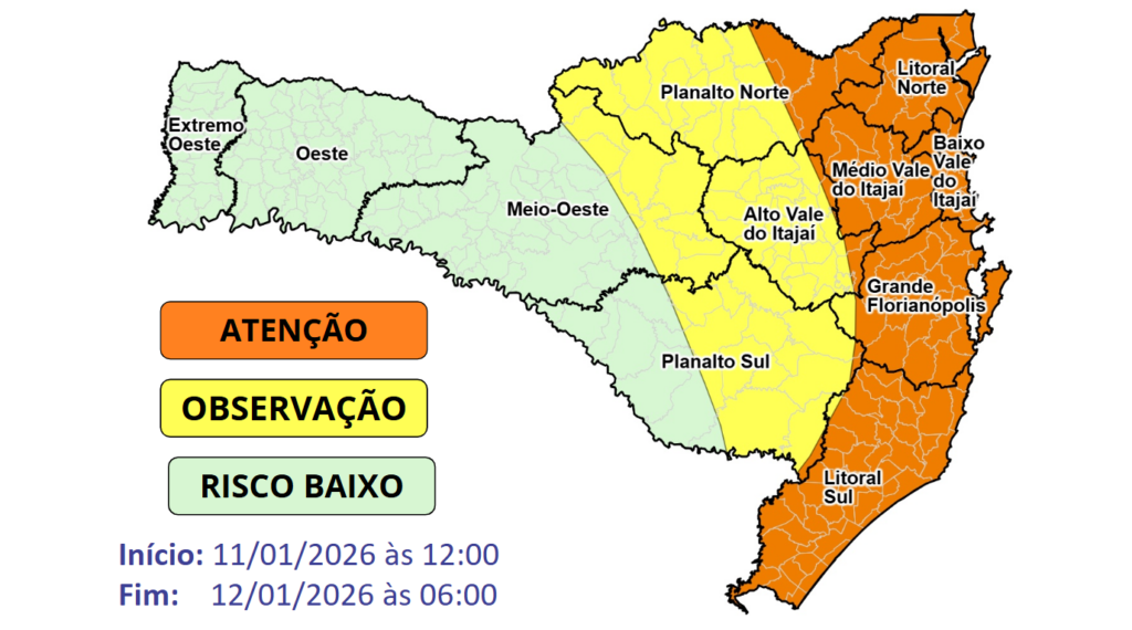 O domingo (11) que já começou com a ocorrência de chuva fraca e esparsa no centro/leste do estado, deve voltar a apresentar condições para formação de tempestades, sobretudo entre à tarde e noite entre o Meio-Oeste, Planalto Norte, Vale do Itajaí e Litoral, trazendo risco moderado a alto para ocorrências associadas a destelhamentos, quedas de galhos e árvores, danos na rede elétrica, alagamentos e enxurradas pontuais. No Oeste, a instabilidade é menor e mais irregular, com risco baixo para ocorrências.