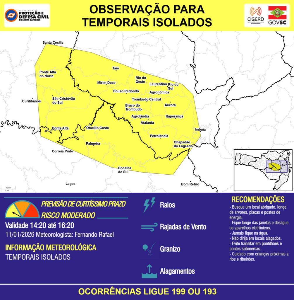 OBSERVAÇÃO – 11/01 14:20 – TEMPORAIS ISOLADOS com RAIOS, RAJADAS DE VENTO, GRANIZO e ALAGAMENTOS pontuais para os municípios de Agrolândia, Agronômica, Atalanta, Aurora, Bocaina do Sul, Bom Retiro, Braço do Trombudo, Chapadão do Lageado, Correia Pinto, Curitibanos, Imbuia, Ituporanga, Lages, Laurentino, Mirim Doce, Otacílio Costa, Palmeira, Petrolândia, Ponte Alta, Ponte Alta do Norte, Pouso Redondo, Rio do Oeste, Rio do Sul, Santa Cecília, São Cristóvão do Sul, Taió, Trombudo Central nas próximas 2 horas. Ocorrências ligue 199 ou 193.