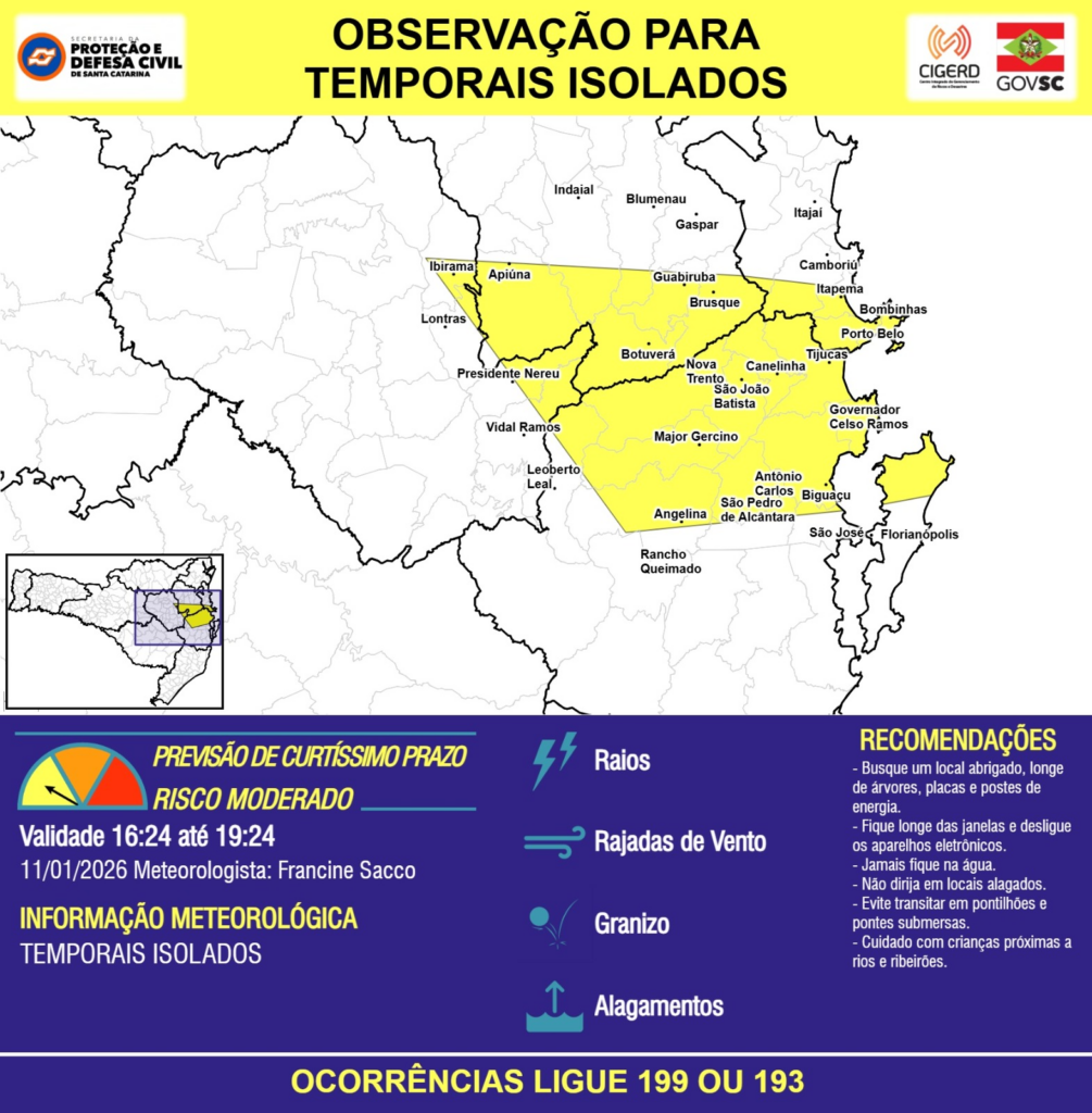 OBSERVAÇÃO – 11/01 16:24 – TEMPORAIS ISOLADOS com RAIOS, RAJADAS DE VENTO, GRANIZO e ALAGAMENTOS pontuais para as regiões da Grande Florianópolis, Baixo, Médio e Alto Vale do Itajaí nas próximas 3 horas. Ocorrências ligue 199 ou 193.