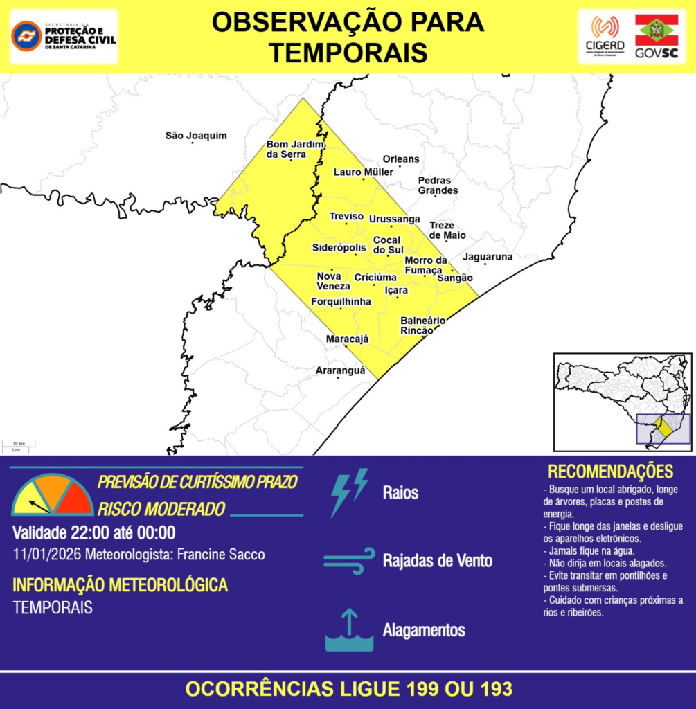 OBSERVAÇÃO – 11/01 22:00 – TEMPORAIS com RAIOS, RAJADAS DE VENTO e ALAGAMENTOS pontuais para as regiões do Planalto Sul e Litoral Sul nas próximas 2 horas. Ocorrências ligue 199 ou 193.