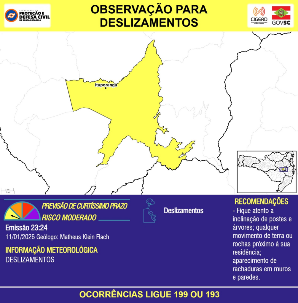 OBSERVAÇÃO – 11/01 23:24 – DESLIZAMENTOS para o município de Ituporanga.