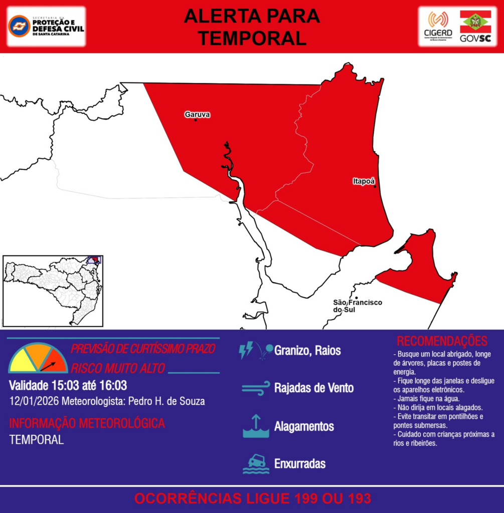 ALERTA – 12/01 15:03 – TEMPORAL com RAJADAS DE VENTO, ALAGAMENTOS, GRANIZO, RAIOS e risco de ENXURRADAS para os municípios de Garuva, Itapoá e São Francisco do Sul na próxima hora. Ocorrências ligue 199 ou 193.