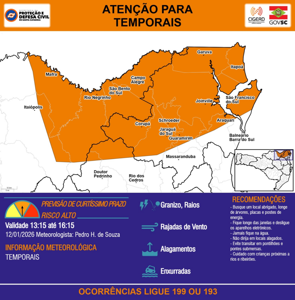 ATENÇÃO – 12/01 13:15 – TEMPORAIS com RAJADAS DE VENTO, ALAGAMENTOS, GRANIZO, RAIOS e risco de ENXURRADAS para áreas das regiões do Planalto Norte, Litoral Norte e Médio Vale do Itajaí nas próximas 3 horas. Ocorrências ligue 199 ou 193.