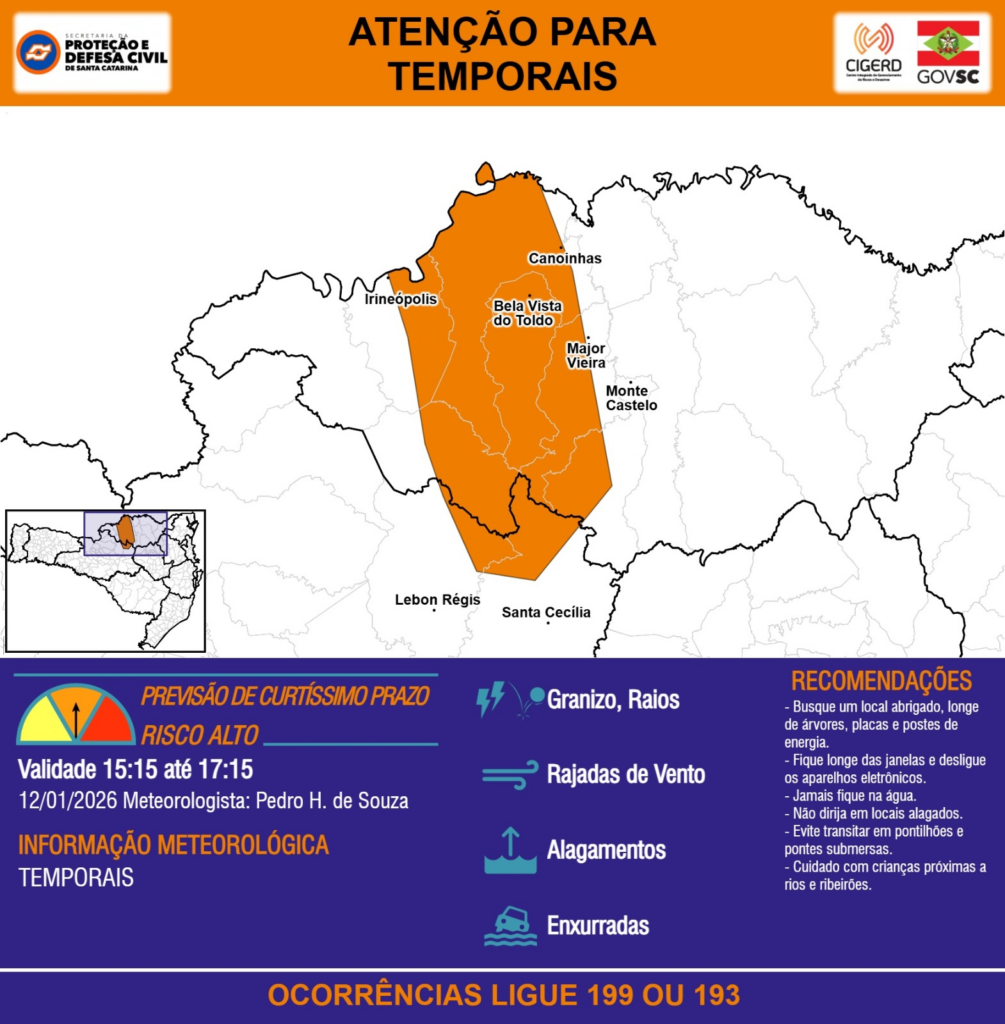 ATENÇÃO – 12/01 15:15 – TEMPORAIS com RAJADAS DE VENTO, ALAGAMENTOS, GRANIZO, RAIOS e risco de ENXURRADAS para os municípios de Bela Vista do Toldo, Canoinhas, Irineópolis, Lebon Régis, Major Vieira, Monte Castelo e Santa Cecília nas próximas 2 horas. Ocorrências ligue 199 ou 193.