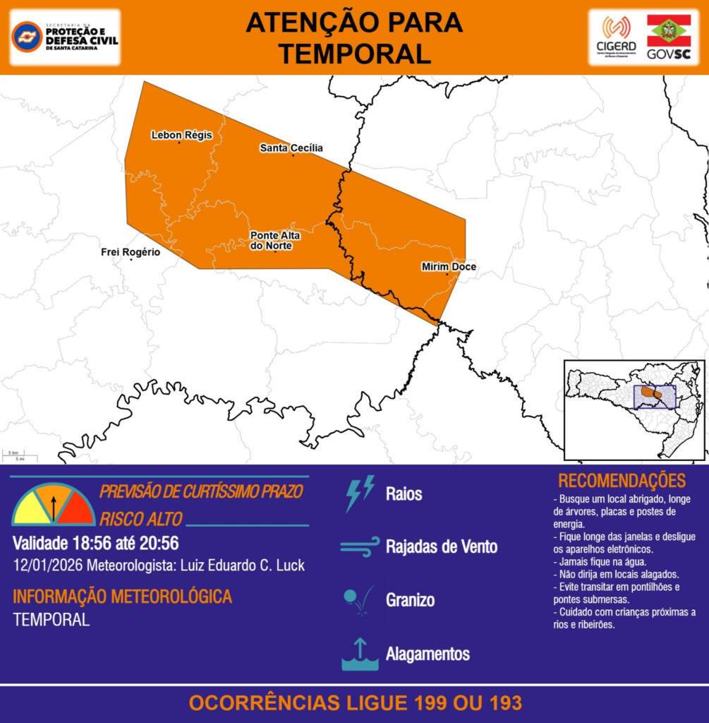 ATENÇÃO – 12/01 18:56 – TEMPORAL com RAIOS, RAJADAS DE VENTO, GRANIZO e ALAGAMENTOS para os municípios de Frei Rogério, Lebon Régis, Mirim Doce, Ponte Alta do Norte, Santa Cecília nas próximas 2 horas. Ocorrências ligue 199 ou 193.