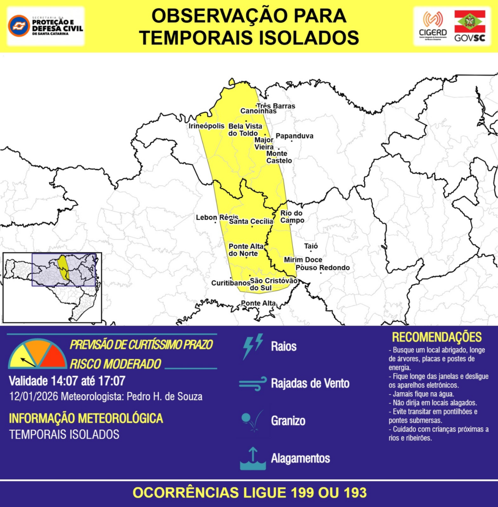 OBSERVAÇÃO – 12/01 14:07 – TEMPORAIS ISOLADOS com RAIOS, RAJADAS DE VENTO, GRANIZO e ALAGAMENTOS pontuais para os municípios de Bela Vista do Toldo, Canoinhas, Curitibanos, Irineópolis, Lebon Régis, Major Vieira, Mirim Doce, Monte Castelo, Papanduva, Ponte Alta, Ponte Alta do Norte, Pouso Redondo, Rio do Campo, Santa Cecília, São Cristóvão do Sul, Taió e Três Barras nas próximas 3 horas. Ocorrências ligue 199 ou 193.