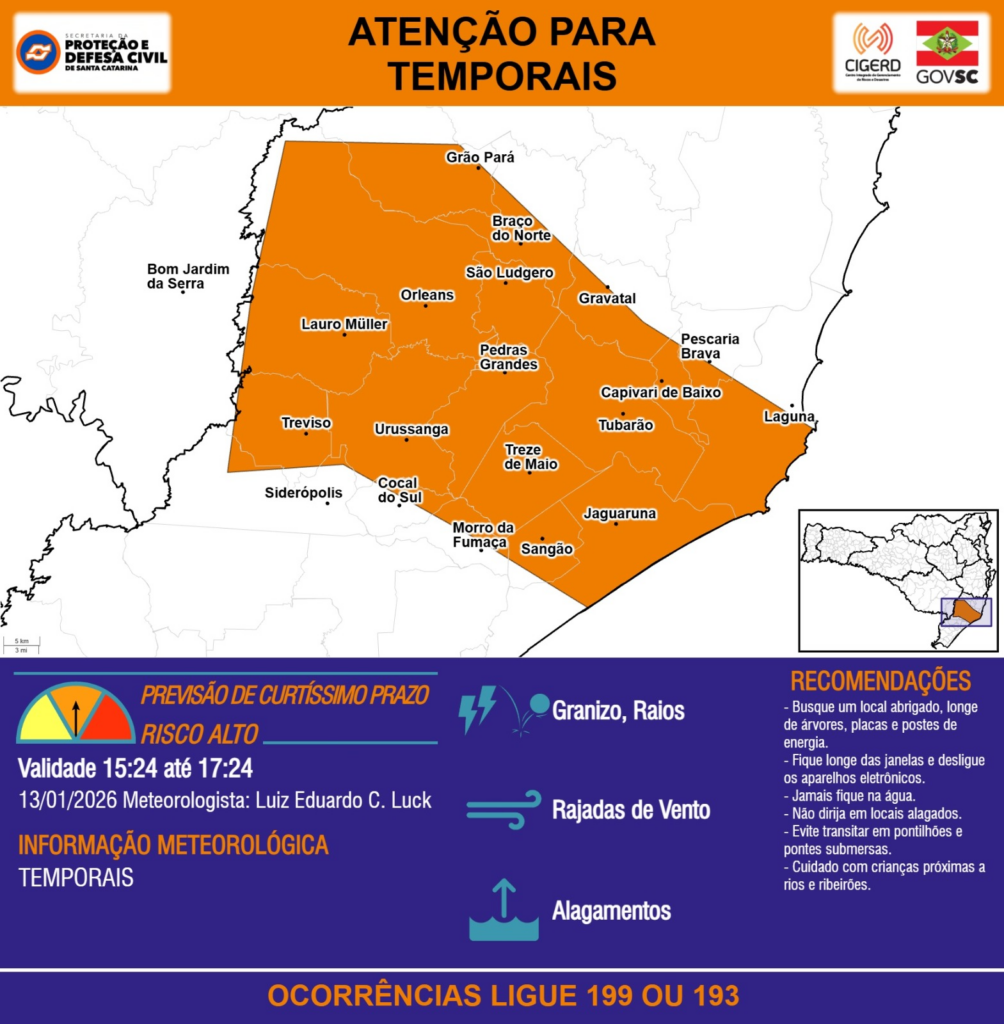 ATENÇÃO – 13/01 15:24 – TEMPORAIS com RAJADAS DE VENTO, ALAGAMENTOS, GRANIZO e RAIOS para os municípios de Bom Jardim da Serra, Braço do Norte, Capivari de Baixo, Cocal do Sul, Gravatal, Grão Pará, Jaguaruna, Laguna, Lauro Müller, Morro da Fumaça, Orleans, Pedras Grandes, Pescaria Brava, Sangão, Siderópolis, São Ludgero, Treviso, Treze de Maio, Tubarão e Urussanga nas próximas 2 horas. Ocorrências ligue 199 ou 193.