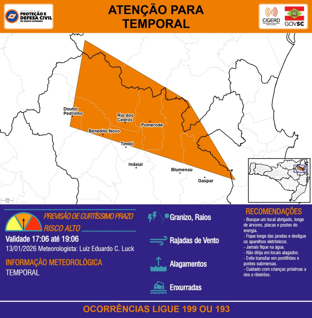 ATENÇÃO – 13/01 17:06 – TEMPORAL com RAJADAS DE VENTO, ALAGAMENTOS, GRANIZO, RAIOS e risco de ENXURRADAS para os municípios de Benedito Novo, Blumenau, Doutor Pedrinho, Gaspar, Indaial, Pomerode, Rio Negrinho, Rio dos Cedros e Timbó nas próximas 2 horas. Ocorrências ligue 199 ou 193.