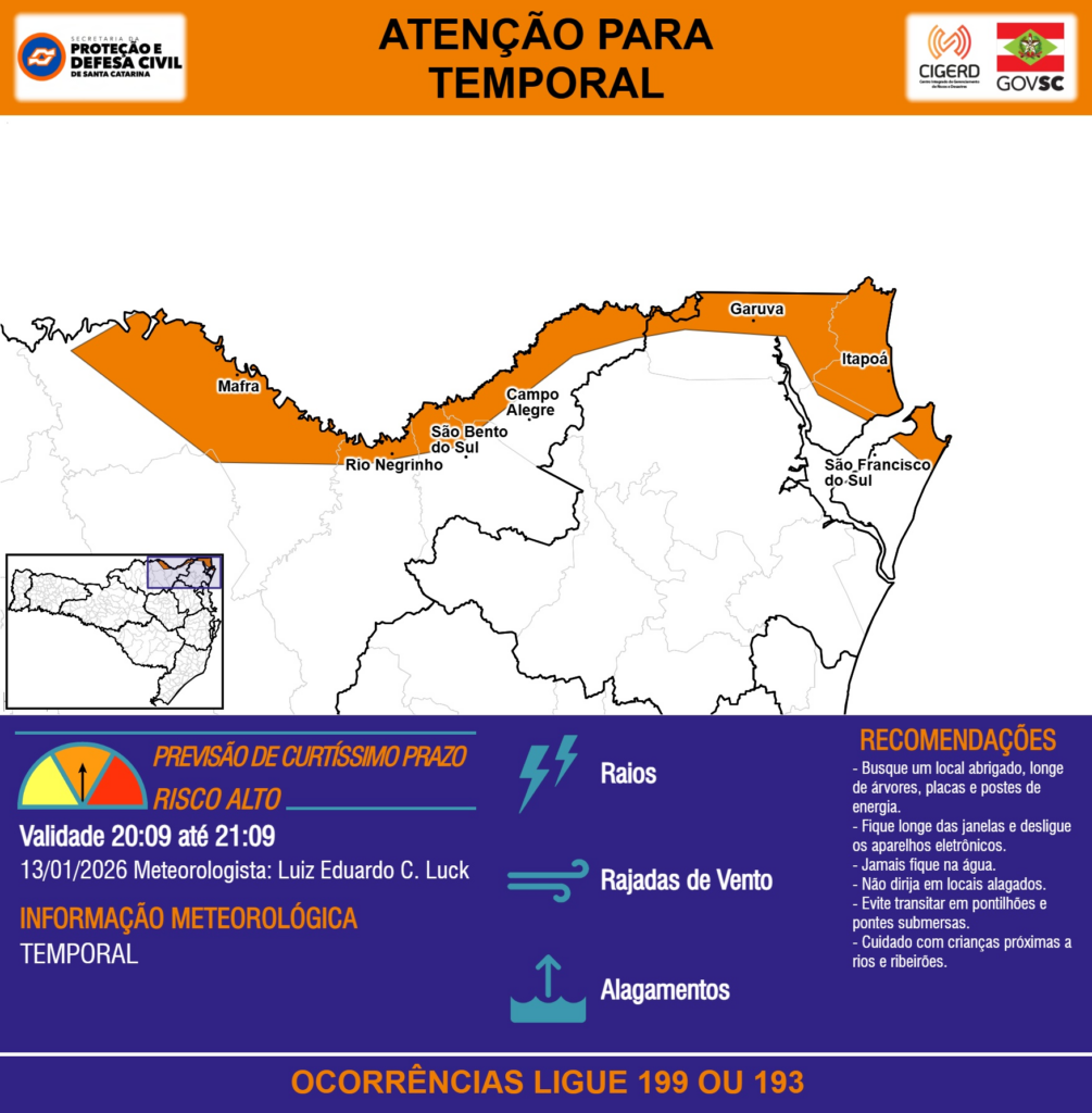 ATENÇÃO – 13/01 20:09 – TEMPORAL com RAIOS, RAJADAS DE VENTO e ALAGAMENTOS para os municípios de Campo Alegre, Garuva, Itapoá, Mafra, Rio Negrinho, São Bento do Sul e São Francisco do Sul na próxima hora. Ocorrências ligue 199 ou 193.