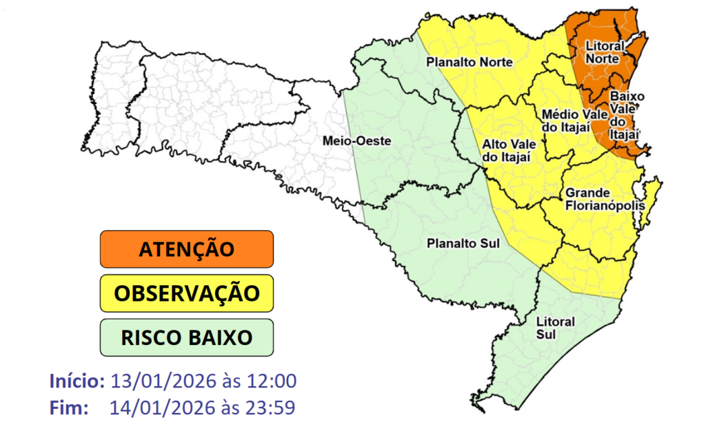 As áreas em atenção, que incluem parte do Vale do Itajaí e do Litoral Norte, apresentam risco alto para alagamentos, enxurradas, destelhamentos, danos na rede elétrica e queda de galhos e árvores. Nas demais áreas o risco é baixo a moderado. Essa condição é motivada pela combinação de calor, umidade e instabilidades.