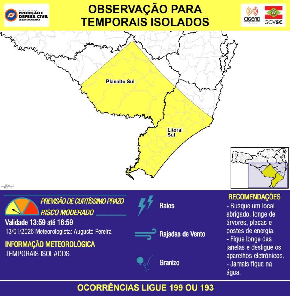 OBSERVAÇÃO – 13/01 13:59 – TEMPORAIS ISOLADOS com RAIOS, RAJADAS DE VENTO e GRANIZO para as regiões do Planalto Sul e Litoral Sul nas próximas 3 horas. Ocorrências ligue 199 ou 193.
