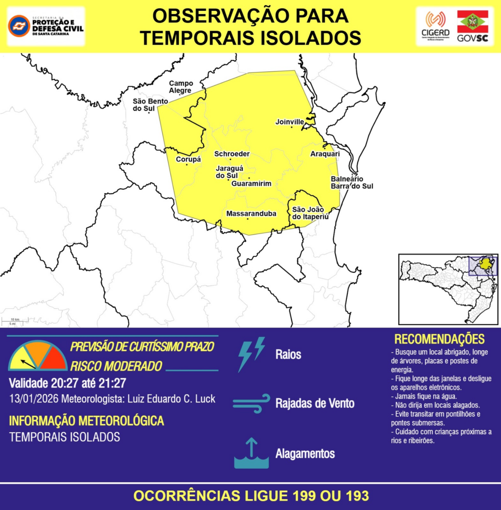 OBSERVAÇÃO – 13/01 20:27 – TEMPORAIS ISOLADOS com RAIOS, RAJADAS DE VENTO e ALAGAMENTOS pontuais para os municípios de Araquari, Balneário Barra do Sul, Campo Alegre, Corupá, Guaramirim, Jaraguá do Sul, Joinville, Massaranduba, Schroeder, São Bento do Sul e São João do Itaperiú na próxima hora. Ocorrências ligue 199 ou 193.