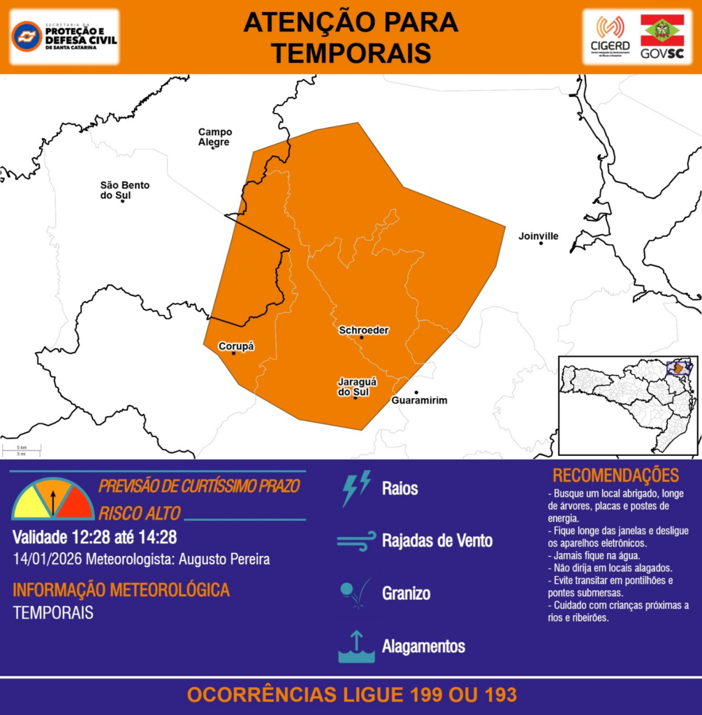 ATENÇÃO – 14/01 12:28 – TEMPORAIS com RAIOS, RAJADAS DE VENTO, GRANIZO e ALAGAMENTOS para as regiões do Planalto Norte e Litoral Norte nas próximas 2 horas. Ocorrências ligue 199 ou 193.