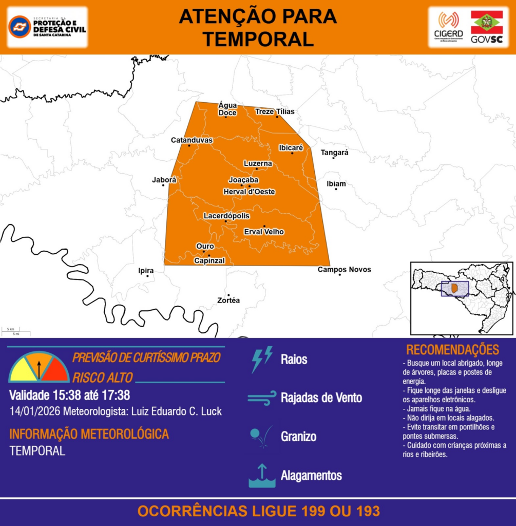 ATENÇÃO – 14/01 15:38 – TEMPORAL com RAIOS, RAJADAS DE VENTO, GRANIZO e ALAGAMENTOS para os municípios de Campos Novos, Capinzal, Catanduvas, Erval Velho, Herval d’Oeste, Ibiam, Ibicaré, Ipira, Jaborá, Joaçaba, Lacerdópolis, Luzerna, Ouro, Tangará, Treze Tílias, Zortéa e Água Doce nas próximas 2 horas. Ocorrências ligue 199 ou 193.