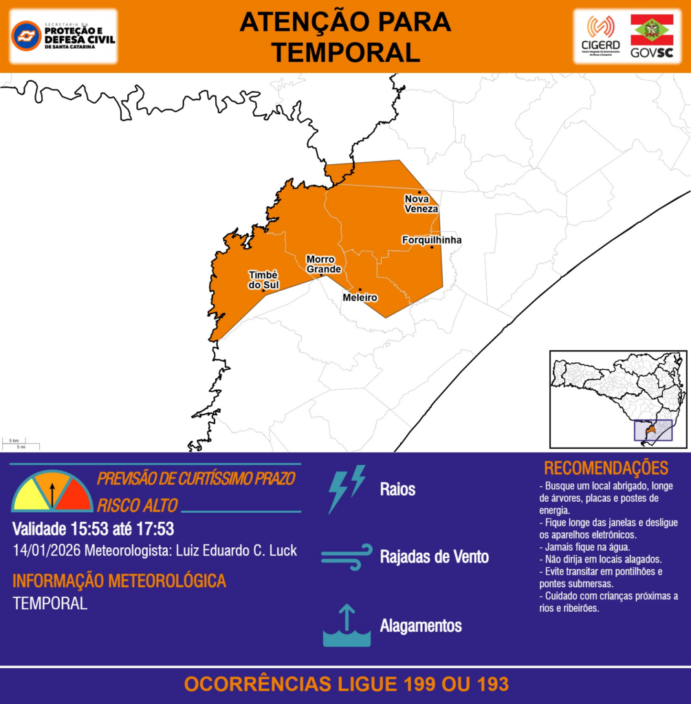 ATENÇÃO – 14/01 15:53 – TEMPORAL com RAIOS, RAJADAS DE VENTO e ALAGAMENTOS para os municípios de Bom Jardim da Serra, Forquilhinha, Meleiro, Morro Grande, Nova Veneza e Timbé do Sul nas próximas 2 horas. Ocorrências ligue 199 ou 193.
