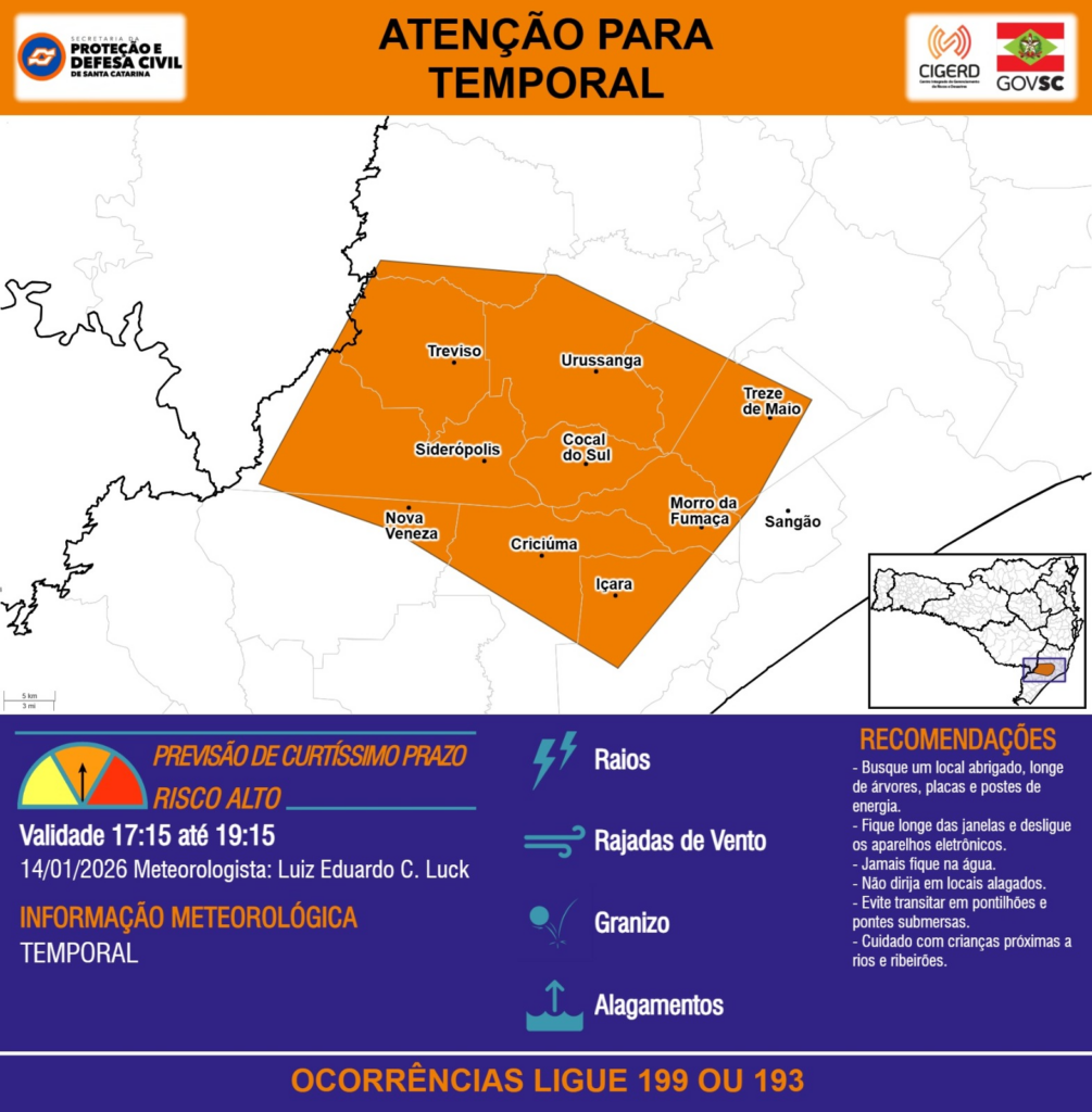 ATENÇÃO – 14/01 17:15 – TEMPORAL com RAIOS, RAJADAS DE VENTO, GRANIZO e ALAGAMENTOS para os municípios de Cocal do Sul, Criciúma, Içara, Morro da Fumaça, Nova Veneza, Sangão, Siderópolis, Treviso, Treze de Maio e Urussanga nas próximas 2 horas. Ocorrências ligue 199 ou 193.