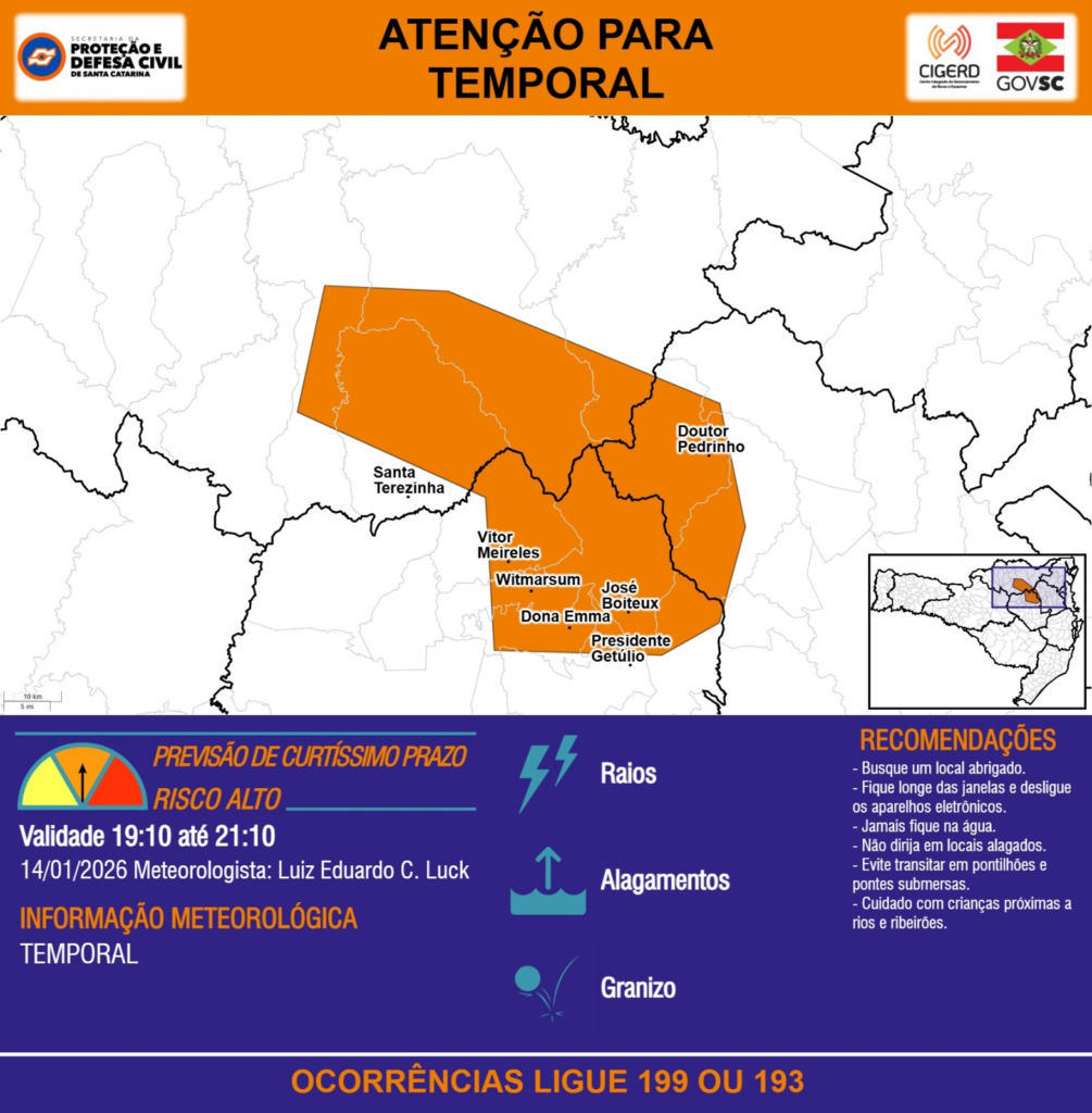 ATENÇÃO – 14/01 19:10 – TEMPORAL com RAIOS, ALAGAMENTOS e GRANIZO para os municípios de Dona Emma, Doutor Pedrinho, José Boiteux, Presidente Getúlio, Santa Terezinha, Vitor Meireles e Witmarsum nas próximas 2 horas. Ocorrências ligue 199 ou 193.