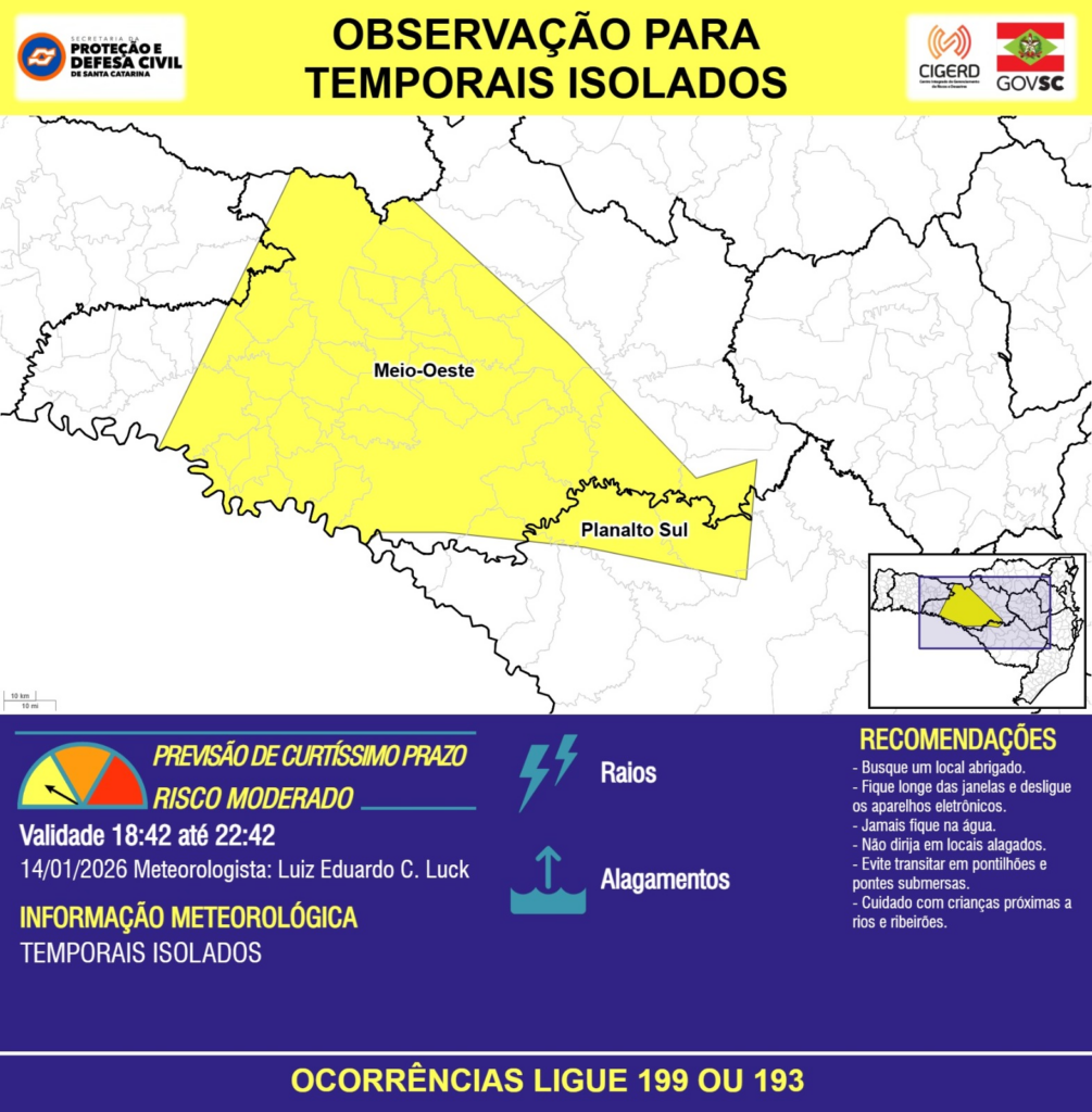 OBSERVAÇÃO – 14/01 18:42 – TEMPORAIS ISOLADOS com RAIOS e ALAGAMENTOS pontuais para as regiões do Oeste, Meio-Oeste e Planalto Sul nas próximas 4 horas. Ocorrências ligue 199 ou 193.