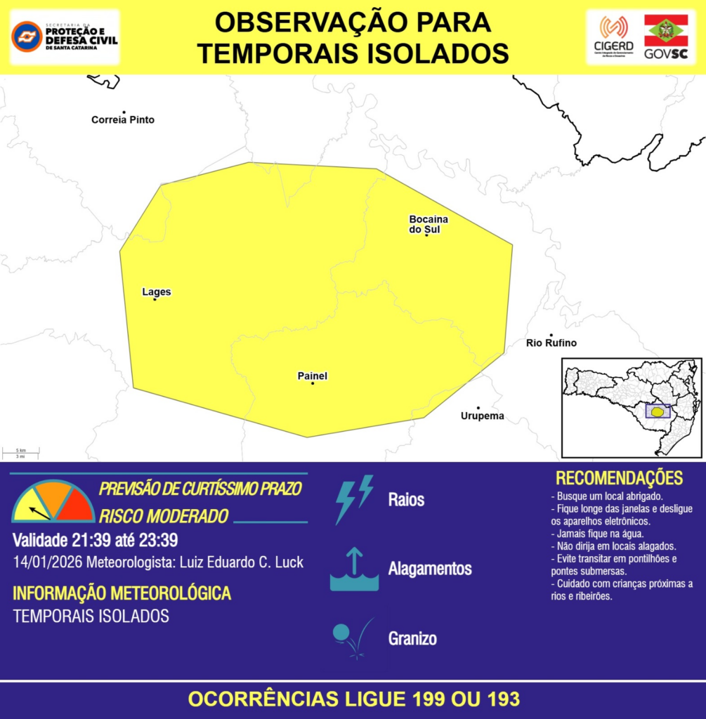 OBSERVAÇÃO – 14/01 21:39 – TEMPORAIS ISOLADOS com RAIOS, GRANIZO e ALAGAMENTOS pontuais para os municípios de Bocaina do Sul, Correia Pinto, Lages, Painel, Rio Rufino e Urupema nas próximas 2 horas. Ocorrências ligue 199 ou 193.
