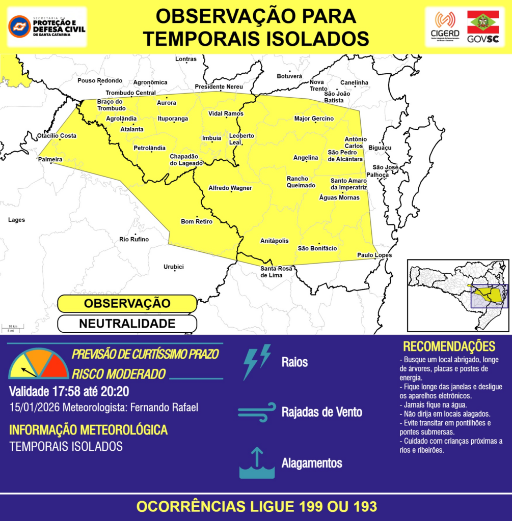 OBSERVAÇÃO – 15/01 17:54 – TEMPORAIS ISOLADOS com RAIOS, RAJADAS DE VENTO e ALAGAMENTOS pontuais para os municípios de Agrolândia, Agronômica, Alfredo Wagner, Angelina, Anitápolis, Antônio Carlos, Atalanta, Aurora, Biguaçu, Bocaina do Sul, Bom Retiro, Botuverá, Braço do Trombudo, Chapadão do Lageado, Imbuia, Ituporanga, Leoberto Leal, Lontras, Major Gercino, Nova Trento, Otacílio Costa, Palhoça, Palmeira, Paulo Lopes, Petrolândia, Pouso Redondo, Presidente Nereu, Rancho Queimado, Rio Rufino, Rio do Sul, Santa Rosa de Lima, Santo Amaro da Imperatriz, São Bonifácio, São José, São João Batista, São Pedro de Alcântara, Trombudo Central, Urubici, Vidal Ramos e Águas Mornas nas próximas 2 horas. Ocorrências ligue 199 ou 193.