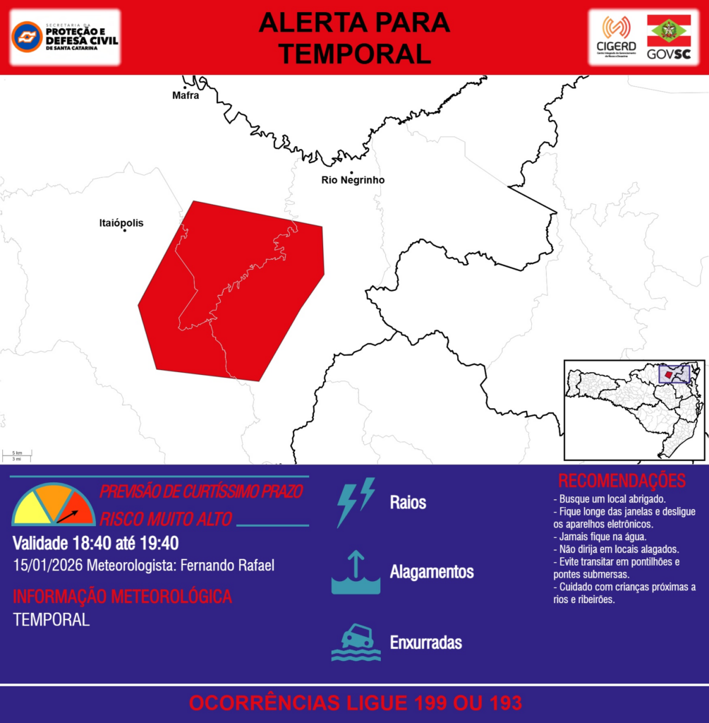 ALERTA – 15/01 18:40 – TEMPORAL com RAIOS, ALAGAMENTOS e risco de ENXURRADAS para os municípios de Itaiópolis, Mafra e Rio Negrinho na próxima hora. Ocorrências ligue 199 ou 193.