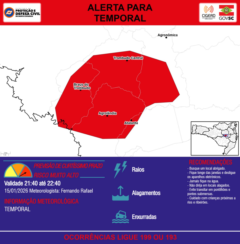 ALERTA – 15/01 21:40 – TEMPORAL com RAIOS, ALAGAMENTOS e risco de ENXURRADAS para os municípios de Agrolândia, Agronômica, Atalanta, Braço do Trombudo, Otacílio Costa e Trombudo Central na próxima hora. Ocorrências ligue 199 ou 193.
