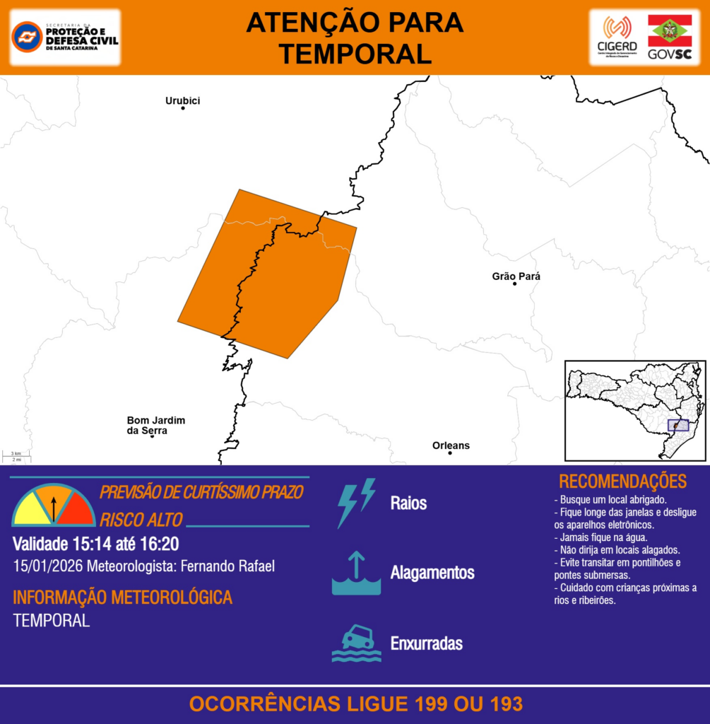 ATENÇÃO – 15/01 15:14 – TEMPORAL com RAIOS, ALAGAMENTOS e risco de ENXURRADAS para os municípios de Bom Jardim da Serra, Grão Pará, Orleans e Urubici na próxima hora. Ocorrências ligue 199 ou 193.