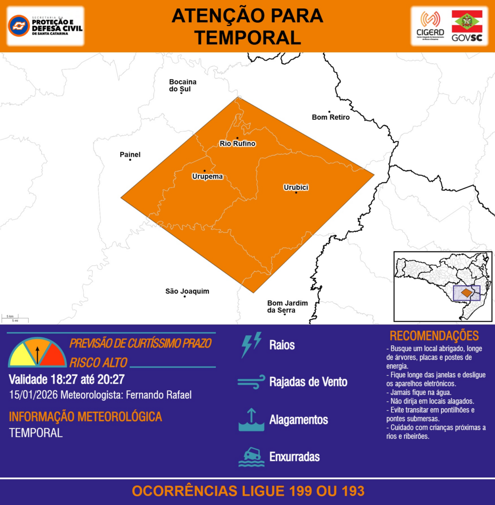ATENÇÃO – 15/01 18:27 – TEMPORAL com RAIOS, RAJADAS DE VENTO, ALAGAMENTOS e risco de ENXURRADAS para os municípios de Bocaina do Sul, Bom Jardim da Serra, Bom Retiro, Painel, Rio Rufino, São Joaquim, Urubici e Urupema nas próximas 2 horas. Ocorrências ligue 199 ou 193.