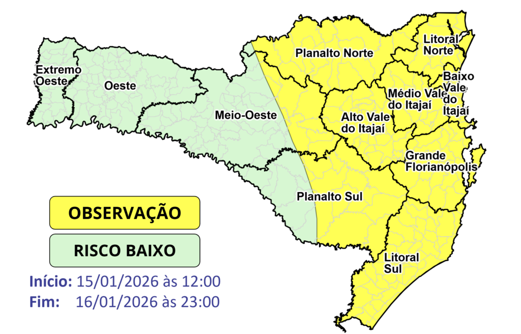 Entre as tardes e noites de quinta-feira (15) e sexta-feira (16), persiste a condição de temporais típicos de verão, semelhante ao que tem ocorrido nesta semana, abrangendo do Meio-Oeste ao Litoral catarinense. Nas áreas de serra, estes temporais tendem a ser mais intensos e concentrados em um curto espaço de tempo. De forma geral, apesar de isolados, os temporais podem ser acompanhados de vendavais e altos acumulados de chuva.