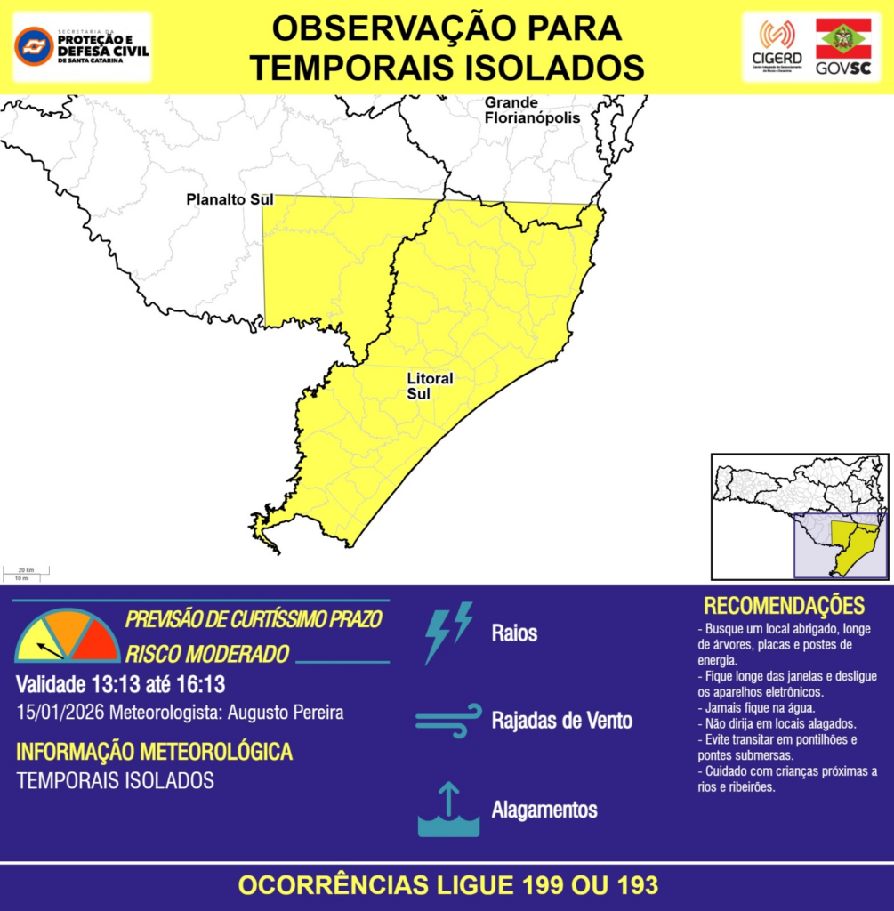 OBSERVAÇÃO – 15/01 13:13 – TEMPORAIS ISOLADOS com RAIOS, RAJADAS DE VENTO e ALAGAMENTOS pontuais para as regiões do Planalto Sul, Litoral Sul e Grande Florianópolis nas próximas 3 horas. Ocorrências ligue 199 ou 193.