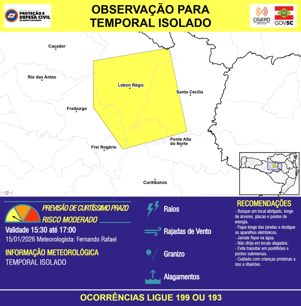OBSERVAÇÃO – 15/01 15:30 – TEMPORAL ISOLADO com RAIOS, RAJADAS DE VENTO, GRANIZO e ALAGAMENTOS pontuais para os municípios de Caçador, Curitibanos, Fraiburgo, Frei Rogério, Lebon Régis, Ponte Alta do Norte, Rio das Antas e Santa Cecília nas próximas 2 horas. Ocorrências ligue 199 ou 193.