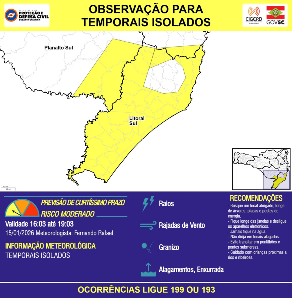 OBSERVAÇÃO – 15/01 16:03 – TEMPORAIS ISOLADOS com RAIOS, RAJADAS DE VENTO, GRANIZO, ALAGAMENTOS pontuais e risco de ENXURRADA para as regiões do Planalto Sul e Litoral Sul nas próximas 3 horas. Ocorrências ligue 199 ou 193.