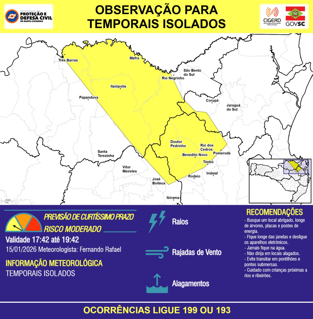 OBSERVAÇÃO – 15/01 17:42 – TEMPORAIS ISOLADOS com RAIOS, RAJADAS DE VENTO e ALAGAMENTOS pontuais para os municípios de Benedito Novo, Corupá, Doutor Pedrinho, Ibirama, Indaial, Itaiópolis, Jaraguá do Sul, José Boiteux, Mafra, Papanduva, Pomerode, Rio Negrinho, Rio dos Cedros, Rodeio, Santa Terezinha, São Bento do Sul, Timbó, Três Barras e Vitor Meireles nas próximas 2 horas. Ocorrências ligue 199 ou 193.