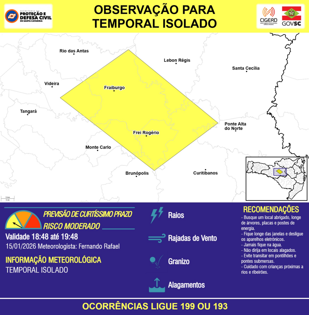 OBSERVAÇÃO – 15/01 18:48 – TEMPORAL ISOLADO com RAIOS, RAJADAS DE VENTO, GRANIZO e ALAGAMENTOS pontuais para os municípios de Brunópolis, Curitibanos, Fraiburgo, Frei Rogério, Lebon Régis, Monte Carlo, Ponte Alta do Norte, Rio das Antas, Santa Cecília, Tangará e Videira na próxima hora. Ocorrências ligue 199 ou 193.