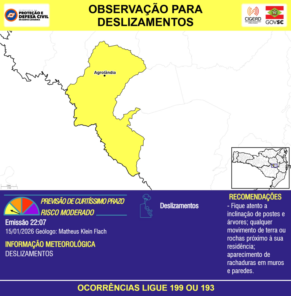 OBSERVAÇÃO – 15/01 22:07 – DESLIZAMENTOS para o município de Agrolândia
