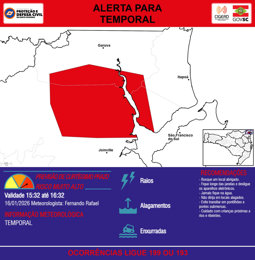 ALERTA – 16/01 15:32 – TEMPORAL com RAIOS, ALAGAMENTOS e risco de ENXURRADAS para os municípios de Garuva, Itapoá, Joinville e São Francisco do Sul na próxima hora. Ocorrências ligue 199 ou 193.