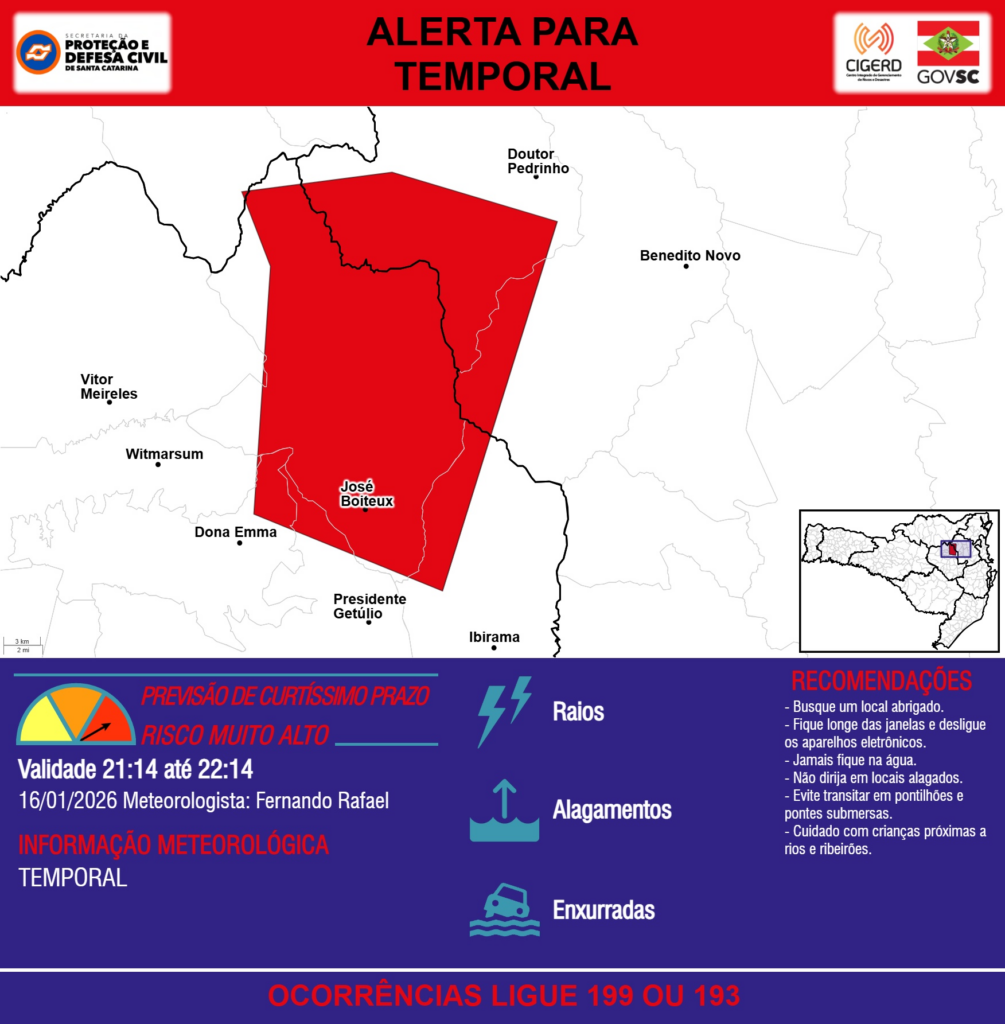 ALERTA – 16/01 21:14 – TEMPORAL com RAIOS, ALAGAMENTOS e risco de ENXURRADAS para os municípios de Benedito Novo, Dona Emma, Doutor Pedrinho, Ibirama, José Boiteux, Presidente Getúlio, Vitor Meireles e Witmarsum na próxima hora. Ocorrências ligue 199 ou 193.