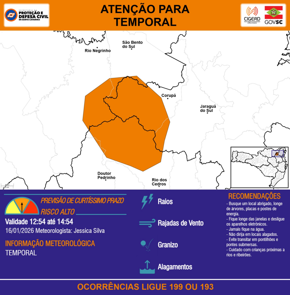 ATENÇÃO – 16/01 12:54 – TEMPORAL com RAIOS, RAJADAS DE VENTO, GRANIZO e ALAGAMENTOS para os municípios de Corupá, Doutor Pedrinho, Jaraguá do Sul, Rio Negrinho, Rio dos Cedros e São Bento do Sul nas próximas 2 horas. Ocorrências ligue 199 ou 193.