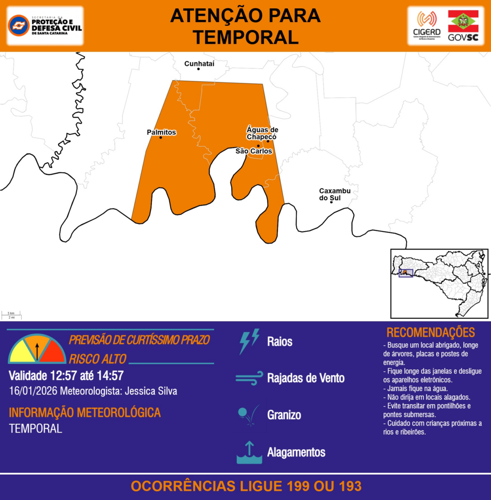 ATENÇÃO – 16/01 12:57 – TEMPORAL com RAIOS, RAJADAS DE VENTO, GRANIZO e ALAGAMENTOS para os municípios de Caxambu do Sul, Cunhataí, Palmitos, São Carlos e Águas de Chapecó nas próximas 2 horas. Ocorrências ligue 199 ou 193.