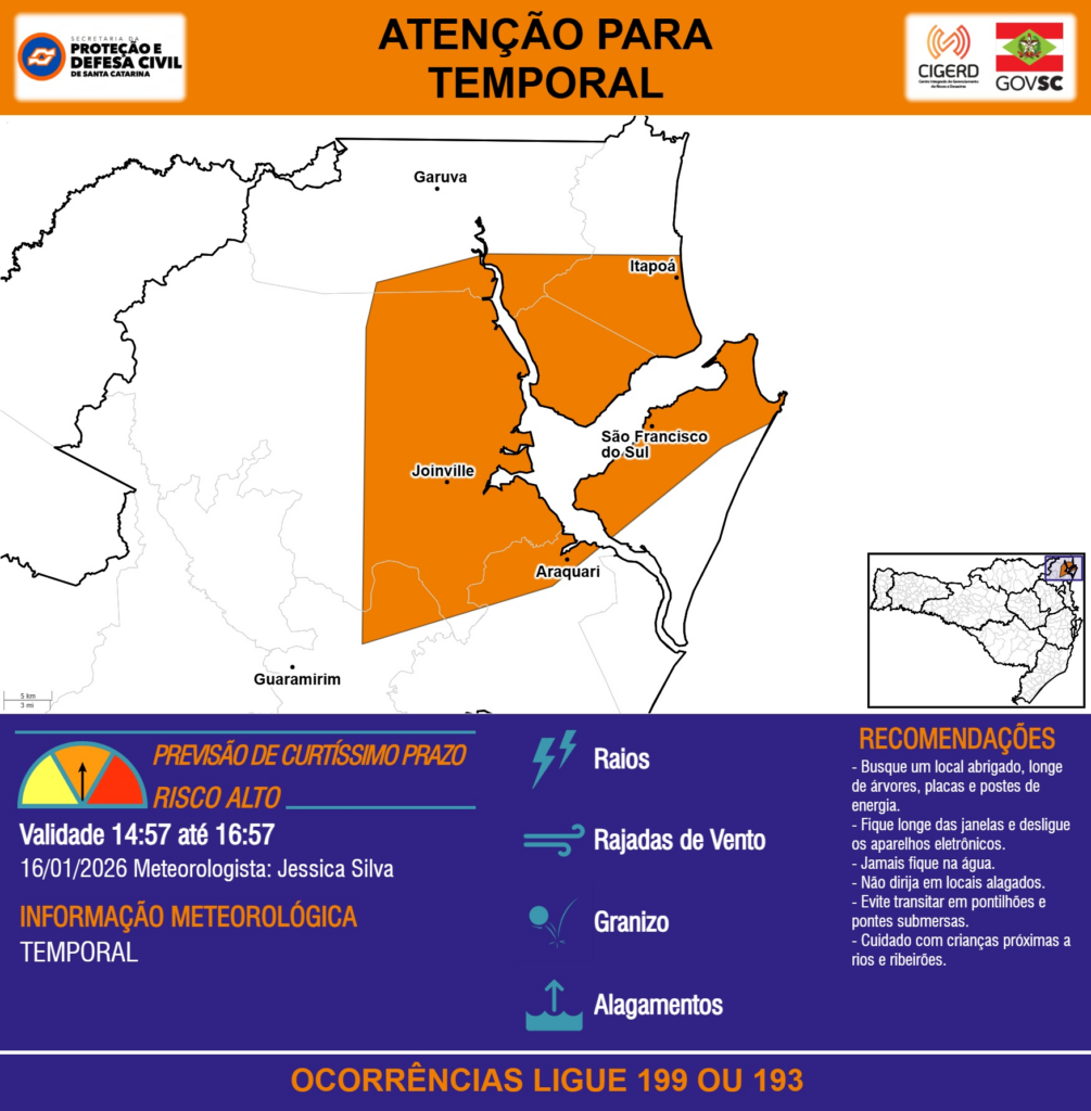 ATENÇÃO – 16/01 14:57 – TEMPORAL com RAIOS, RAJADAS DE VENTO, GRANIZO e ALAGAMENTOS para os municípios de Araquari, Garuva, Guaramirim, Itapoá, Joinville e São Francisco do Sul nas próximas 2 horas. Ocorrências ligue 199 ou 193.