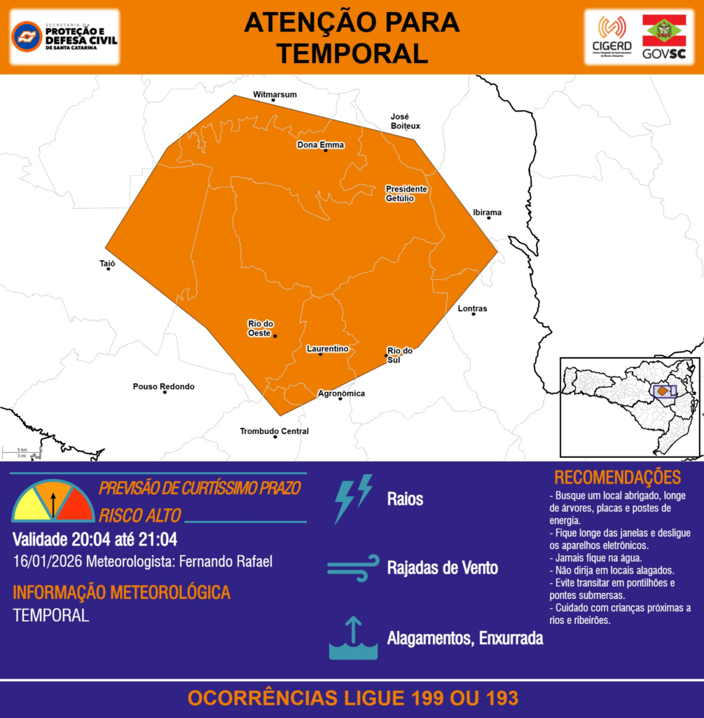 ATENÇÃO – 16/01 20:04 – TEMPORAL com RAIOS, RAJADAS DE VENTO, ALAGAMENTOS e risco de ENXURRADA para os municípios de Agronômica, Dona Emma, Ibirama, José Boiteux, Laurentino, Lontras, Pouso Redondo, Presidente Getúlio, Rio do Oeste, Rio do Sul, Taió, Trombudo Central e Witmarsum na próxima hora. Ocorrências ligue 199 ou 193.