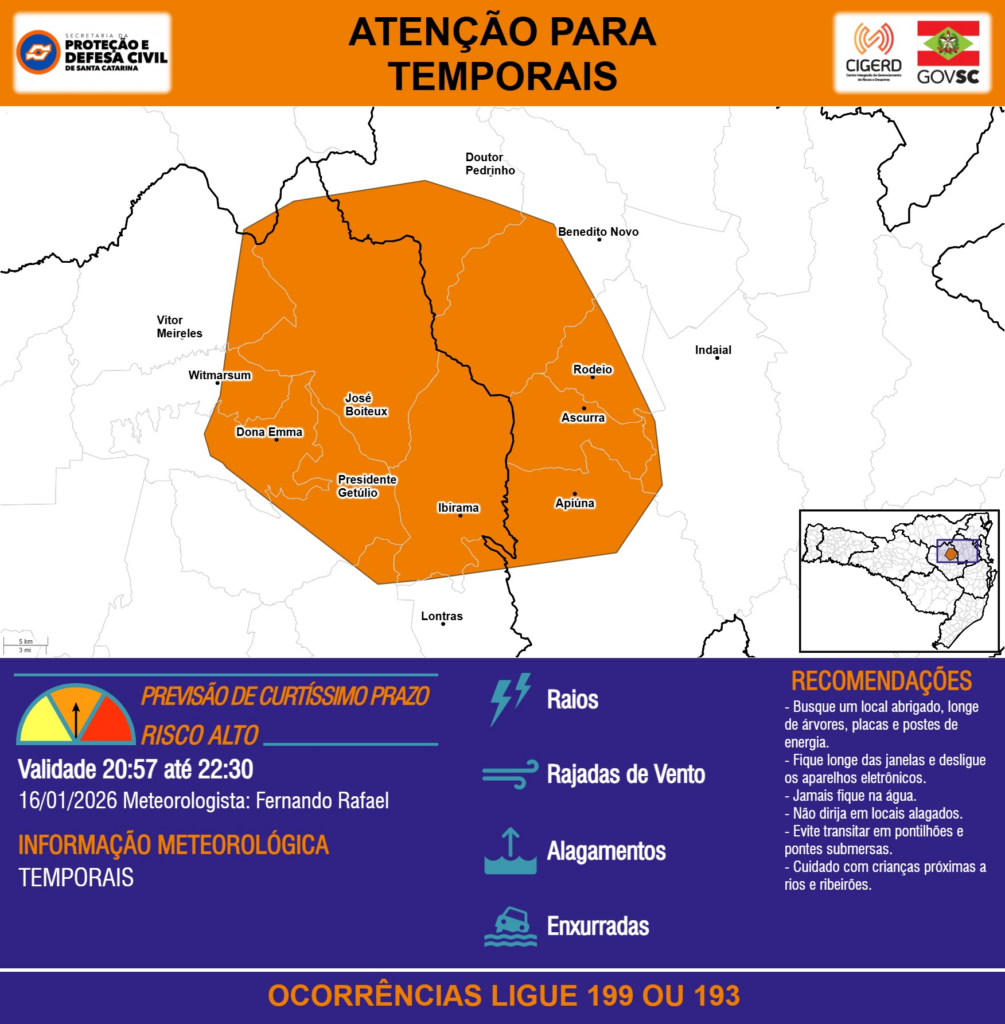 ATENÇÃO – 16/01 20:57 – TEMPORAIS com RAIOS, RAJADAS DE VENTO, ALAGAMENTOS e risco de ENXURRADAS para os municípios de Apiúna, Ascurra, Benedito Novo, Dona Emma, Doutor Pedrinho, Ibirama, Indaial, Itaiópolis, José Boiteux, Lontras, Presidente Getúlio, Rio do Sul, Rodeio, Vitor Meireles e Witmarsum na próxima hora. Ocorrências ligue 199 ou 193.