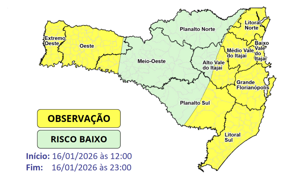 Há condições para temporais isolados, acompanhados por raios, rajadas de vento, chuva pontualmente intensa em curtos períodos de tempo e eventual queda de granizo, especialmente no Litoral, Vale do Itajaí, Oeste e nas regiões serranas do Planalto Sul.