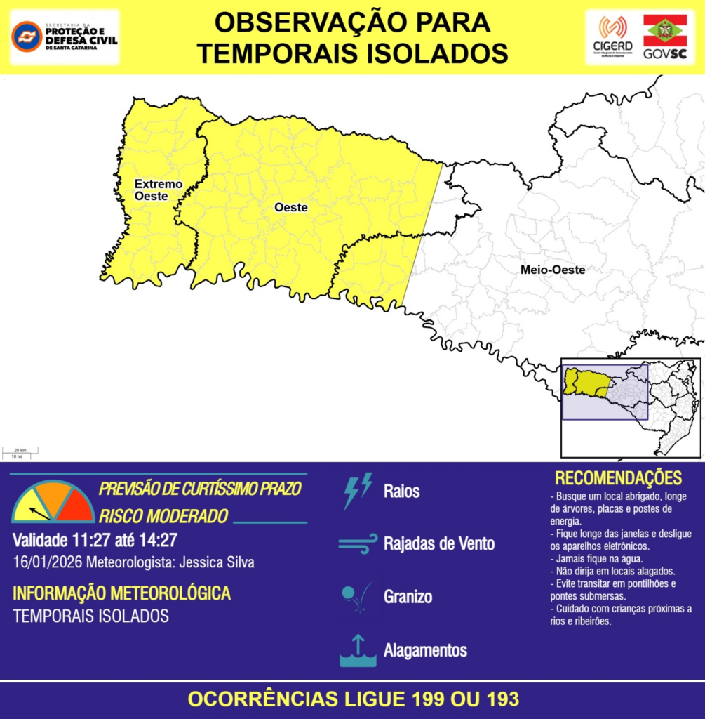 OBSERVAÇÃO – 16/01 11:27 – TEMPORAIS ISOLADOS com RAIOS, RAJADAS DE VENTO, GRANIZO e ALAGAMENTOS pontuais para as regiões do Extremo Oeste, Oeste e Meio-Oeste nas próximas 3 horas. Ocorrências ligue 199 ou 193.