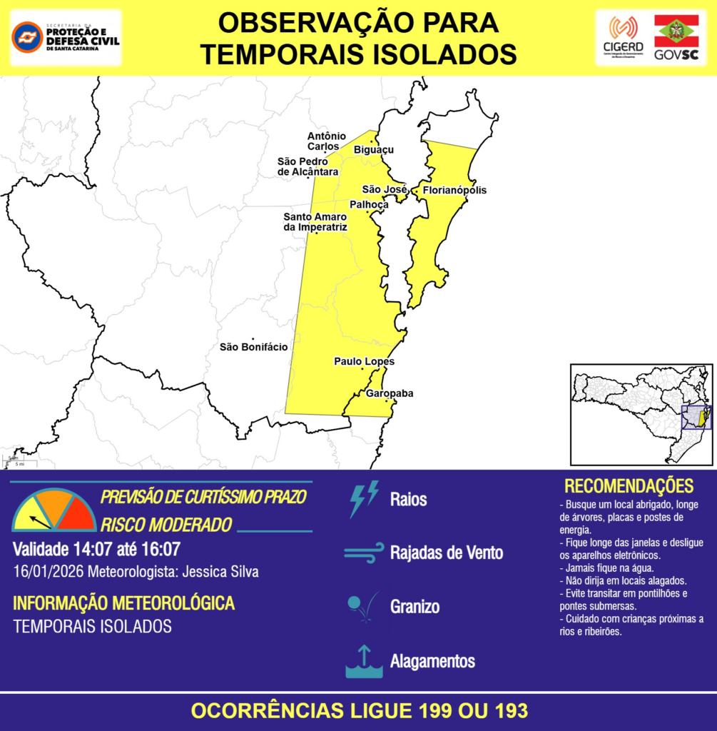 OBSERVAÇÃO – 16/01 14:07 – TEMPORAIS ISOLADOS com RAIOS, RAJADAS DE VENTO, GRANIZO e ALAGAMENTOS pontuais para as regiões do Litoral Sul e Grande Florianópolis nas próximas 2 horas. Ocorrências ligue 199 ou 193.