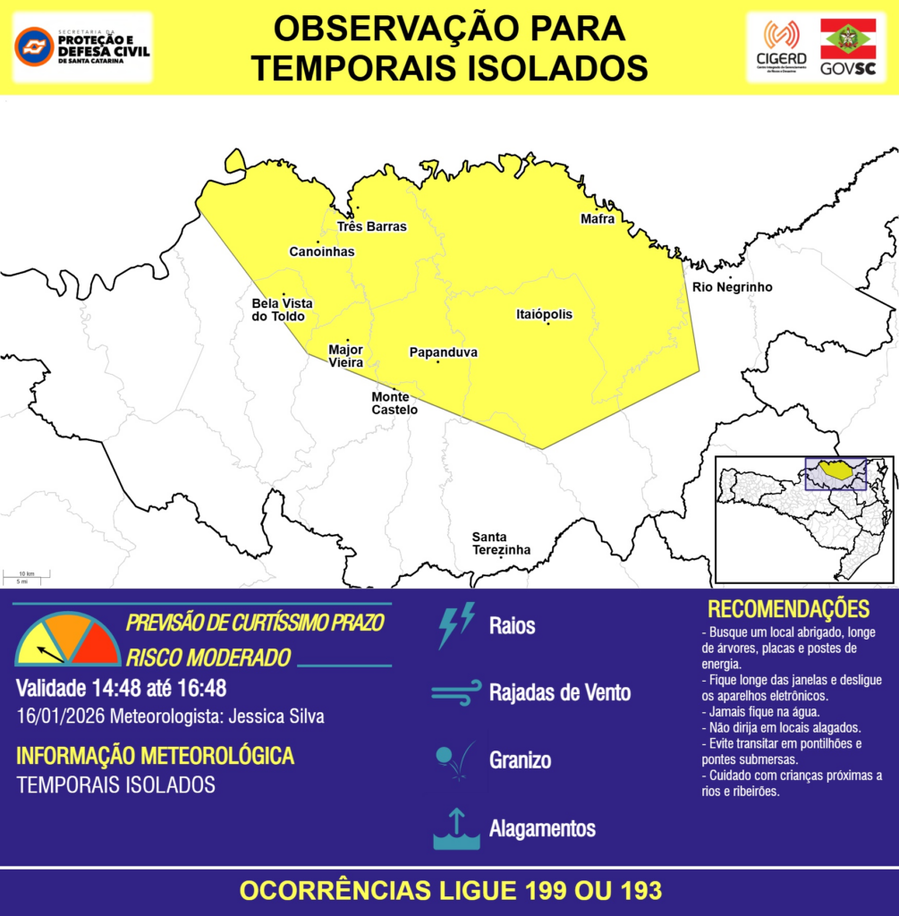 OBSERVAÇÃO – 16/01 14:48 – TEMPORAIS ISOLADOS com RAIOS, RAJADAS DE VENTO, GRANIZO e ALAGAMENTOS pontuais para a região do Planalto Norte nas próximas 2 horas. Ocorrências ligue 199 ou 193.