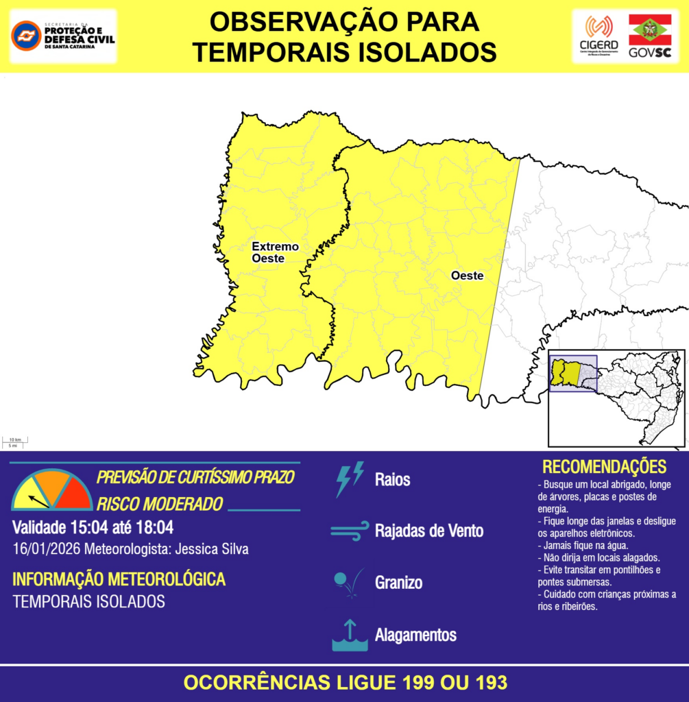 OBSERVAÇÃO – 16/01 15:04 – TEMPORAIS ISOLADOS com RAIOS, RAJADAS DE VENTO, GRANIZO e ALAGAMENTOS pontuais para as regiões do Extremo Oeste e Oeste nas próximas 3 horas. Ocorrências ligue 199 ou 193.