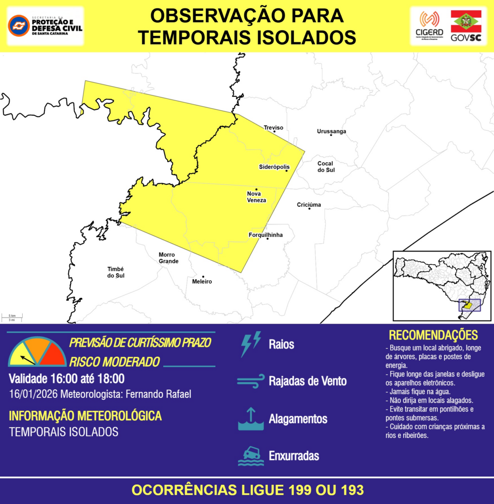OBSERVAÇÃO – 16/01 16:00 – TEMPORAIS ISOLADOS com RAIOS, RAJADAS DE VENTO, ALAGAMENTOS pontuais e risco de ENXURRADAS para os municípios de Bom Jardim da Serra, Cocal do Sul, Criciúma, Forquilhinha, Meleiro, Morro Grande, Nova Veneza, Siderópolis, São Joaquim, Timbé do Sul, Treviso e Urussanga nas próximas 2 horas. Ocorrências ligue 199 ou 193.
