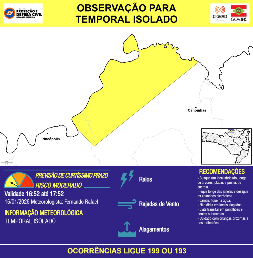 OBSERVAÇÃO – 16/01 16:52 – TEMPORAL ISOLADO com RAIOS, RAJADAS DE VENTO e ALAGAMENTOS pontuais para os municípios de Canoinhas e Irineópolis na próxima hora. Ocorrências ligue 199 ou 193.